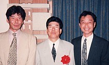 直角とともに文枝師匠の紫綬褒章受賞記念パーティ に招かれました。 直角、文枝師匠、勘朝 |